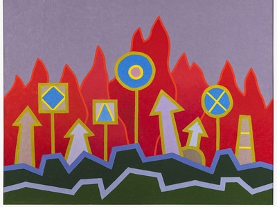 Μάτια και καρδιές, βέλη και τόξα, βαλίτσες, καραβάκια, κύματα ξεδιπλώνουν την περιπέτεια της ζωγραφικής, των υλικών, της κατασκευής και αναδεικνύουν την μοναδική αίσθηση του χρώματος που τον χαρακτηρίζει.