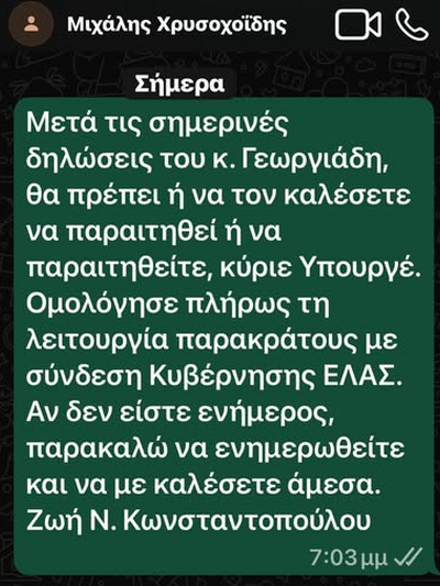 «Ο εν ενεργεία Υπουργός Άδωνις Γεωργιάδης και εν ενεργεία Αντιπρόεδρος της ΝΔ είπε σήμερα στη Βουλή ότι αστυνομικός του Α.Τ. Εξαρχείων του έστειλε μήνυμα-γραπτή αναφορά με την οποία τον ενημέρωνε, κατά παραβίαση του απορρήτου και της νομιμότητας, για την μήνυση που κατέθεσα εναντίον του ιδίου του Υπουργού, δίνοντάς του άμεσα στοιχεία (τόπος και χρόνος κατάθεσης, περιεχόμενο), που μόνο ο Εισαγγελέας δικαιούται να γνωρίζει στο στάδιο αυτό και δίνοντάς του και αναφορά για εμένα, πολιτική αντίπαλο και αντίδικο, ακόμη και για το τι φορούσα, όπως είπε. Με έμφαση δήλωσε μάλιστα ότι ο αστυνομικός προέβη και σε διατύπωση πλήθους γραπτών ύβρεων εναντίον μου. Πρόκειται για πλήρη ομολογία ενεργού παρακράτους.