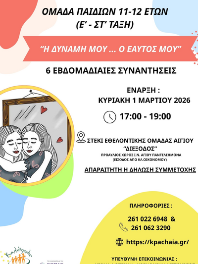 Το Κέντρο Πρόληψης Των Εξαρτήσεων και Προαγωγής της Ψυχοκοινωνικής Υγείας Π.Ε. Αχαΐας Καλλίπολις, σε συνεργασία με τον Εθνικό Οργανισμό Πρόληψης και Αντιμετώπισης Εξαρτήσεων (Ε.Ο.Π.Α.Ε.) και με την υποστήριξη του Δήμου Αιγιαλείας πρόκειται να υλοποιήσει μία νέα ομάδα στο Αίγιο για παιδιά που φοιτούν στην Ε΄& ΣΤ΄ τάξη την τρέχουσα σχολική χρονιά, με τίτλο «Η δύναμή μου… ο εαυτός μου».
