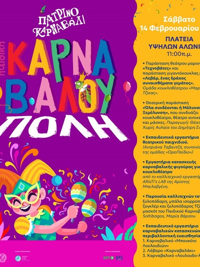 -Θεατρικό Παιχνίδι από την ομάδα Παιδαγωγών & Εμψυχωτών "ΟροΠαίδιο" (συντονίστρια: Αντριάνα Ταβαντζή): «Τα καινούργια ρούχα του βασιλιά του καρνάβαλου». Παίζουμε και με τη φαντασία μας μεταμορφώνουμε ανακυκλώσιμα υλικά, παλιά κουρέλια και φυσικά υλικά. Ένα εργαστήρι γεμάτο κίνηση και δημιουργία, εκεί όπου το παιχνίδι συναντά τη φροντίδα για το περιβάλλον.
