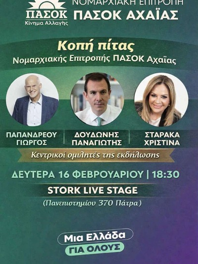Τη Δευτέρα 16 Φεβρουαρίου στις 18:30, η Νομαρχιακή Επιτροπή ΠΑΣΟΚ Αχαΐας κόβει την πρωτοχρονιάτικη πίτα της στο STORK Live Stage (Πανεπιστημίου 370).