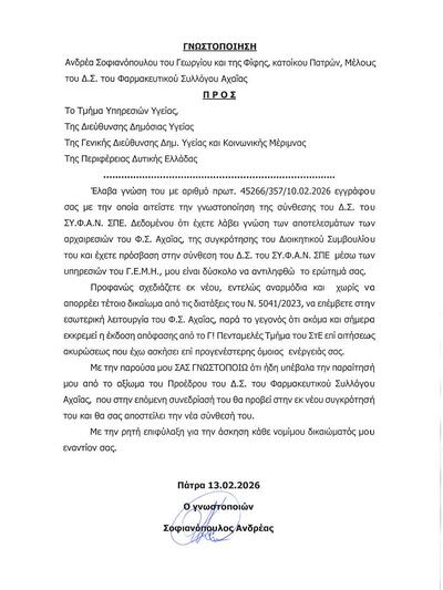 Παραιτήθηκε από τη θέση του Προέδρου του Φαρμακευτικού Συλλόγου Αχαΐας ο Ανδρέας Σοφιανόπουλος.