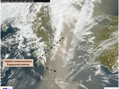 Μεταφορά Σκόνης: Ισχυροί νότιοι άνεμοι ("νοτιάδες") πάνω από τη Σαχάρα και τη Βόρεια Αφρική (Λιβύη, Αλγερία) "σήκωσαν" μεγάλες ποσότητες σκόνης και άμμου, μεταφέροντάς τις στην ανώτερη ατμόσφαιρα πάνω από την Ελλάδα.