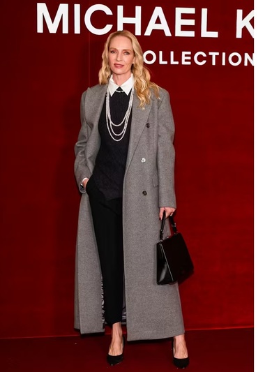 H 55χρονη Αμερικανίδα ηθοποιός – και αξεπέραστη μούσα του Ταραντίνο στις επιτυχίες «Pulp Fiction» και «Kill Bill»- έδωσε το παρών στο Michael Kors show. Ηταν ντυμένη με λιτό μαύρο πουλόβερ και λευκό εσωτερικό πουκάμισο, σε συνδυασμό με μαύρο cigarette παντελόνι και γκρι ανδρόγυνο, μακρύ παλτό. Με τα κλασικά αξεσουάρ του μαργαριταρένιου κολιέ και της μαύρης γόβας, πέτυχε ένα διαχρονικό, υπέρκομψο outfit που δύσκολα οδηγεί σε στυλιστικά λάθη.
