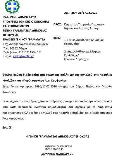 Συγκεκριμένα, η Γενική Γραμματέας Δημόσιας Περιουσίας εξέδωσε έγγραφο το οποίο είχε ως αποδέκτη την Κτηματική Υπηρεσία Πειραιά, Νήσων και Δυτικής Αττικής, δια του οποίου ικανοποιείται πλήρως το αίτημα που είχε υποβάλει, νωρίτερα την ίδια ημέρα (17/2/2026) ο δήμος Νάξου και Μικρών Κυκλάδων, εν είδει ύστατης απόπειρας να εμποδιστεί η κατάληψη μέρους των δύο παραλιών στο Άνω Κουφονήσι από τους επίδοξους επιχειρηματίες.