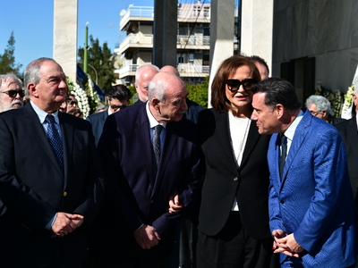 Στεφάνια έστειλαν, μεταξύ άλλων, ο πρωθυπουργός Κυριάκος Μητσοτάκης και η υπουργός Πολιτισμού Λίνα Μενδώνη.