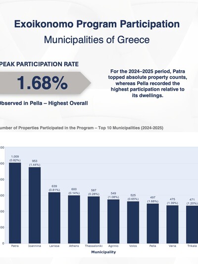 Η Πάτρα καταγράφει τον μεγαλύτερο απόλυτο αριθμό κατοικιών που εντάχθηκαν στο πρόγραμμα «Εξοικονομώ» για την περίοδο 2024–2025, με συνολικά 1.009 σπίτια να λαμβάνουν χρηματοδότηση για ενεργειακή αναβάθμιση.