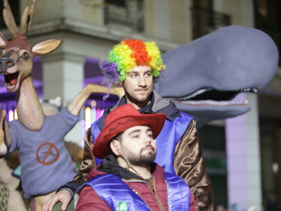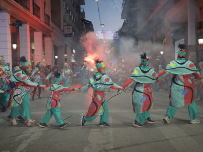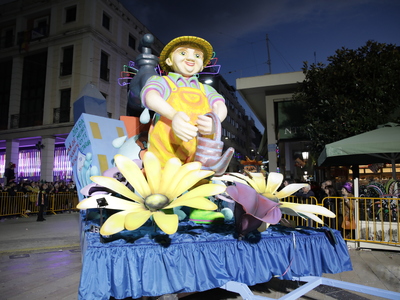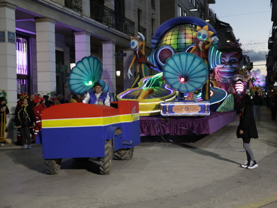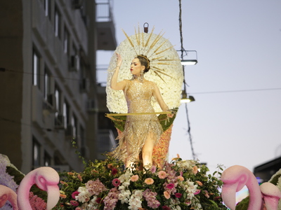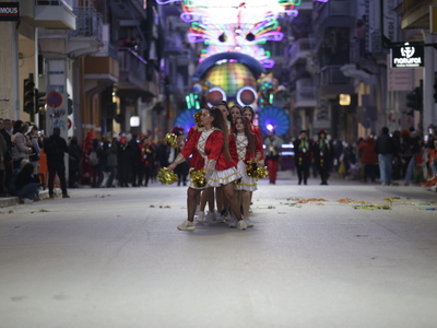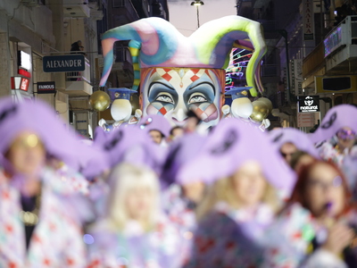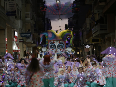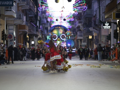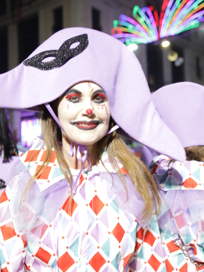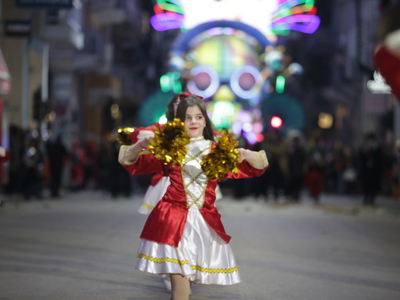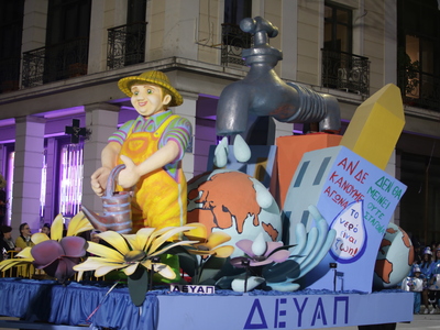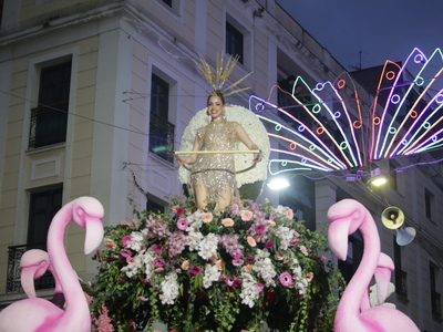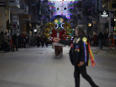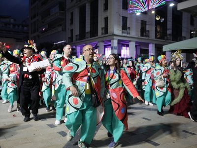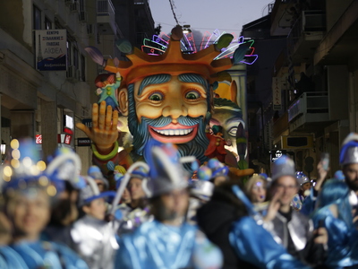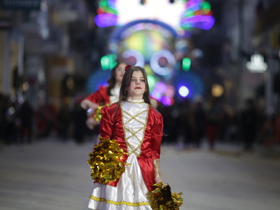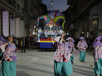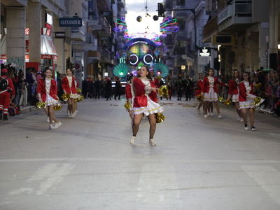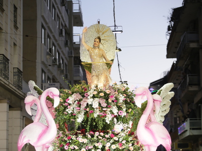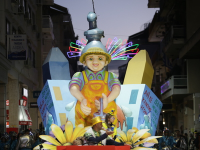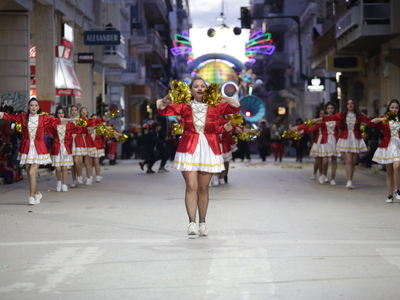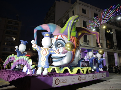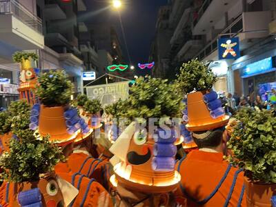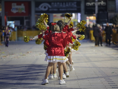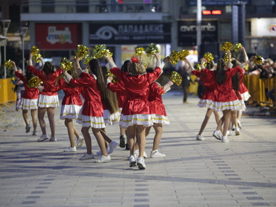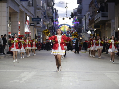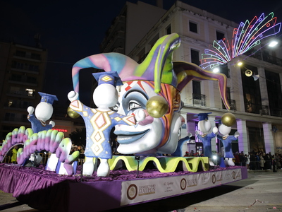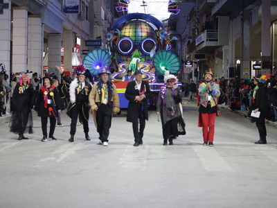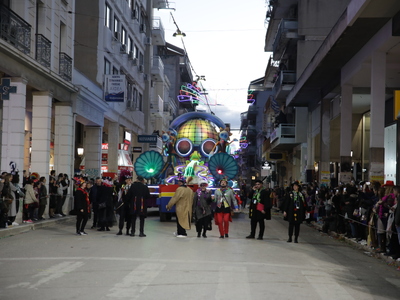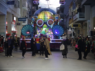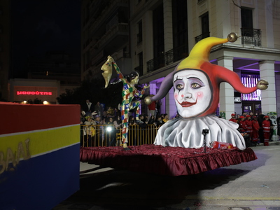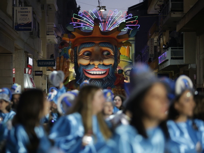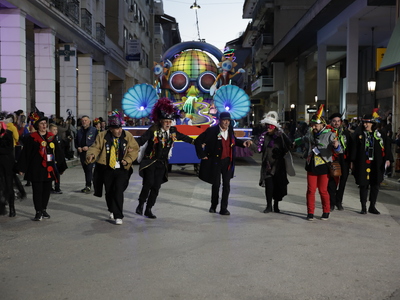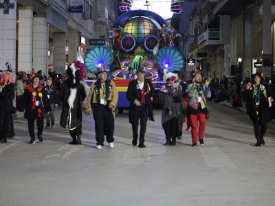 Τα άρματα του Δήμου Πατρέων δίνουν τον ρυθμό, ενώ τα μέλη των πληρωμάτων παρελαύνουν πεζή, σχηματίζοντας ένα αδιάκοπο ποτάμι χρωμάτων, μουσικής και δημιουργικότητας.