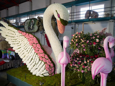 Το άρμα της Βασίλισσας για το 2026 είναι ήδη έτοιμο και συνδυάζει τη φαντασία με τη συμβολική αναγέννηση της άνοιξης. Στο κέντρο δεσπόζει ένας επιβλητικός κύκνος πλαισιωμένος από φλαμίνγκος, ενώ περισσότερα από 30.000 γαρύφαλλα δημιουργούν ένα πολύχρωμο, ανοιξιάτικο σκηνικό που παραπέμπει σε άνθιση και ανανέωση.