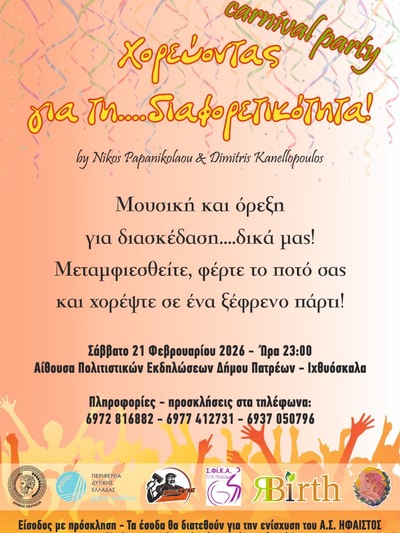 Το τελευταίο Σάββατο της Αποκριάς, 21 Φεβρουαρίου 2026, στον πολυχώρο πολιτισμού Ιχθυόσκαλα, στην Πάτρα μετά τις 23:00 δεν ντυνόμαστε απλώς…ντυνόμαστε με διάθεση, με χαμόγελο και – κυρίως – με αλληλεγγύη!
