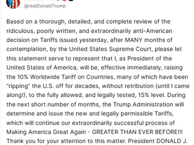 «Με βάση μια διεξοδική, λεπτομερή και πλήρη ανασκόπηση της γελοίας, κακογραμμένης και εξαιρετικά αντιαμερικανικής απόφασης σχετικά με τους δασμούς που εκδόθηκε χθες, μετά από ΠΟΛΛΟΥΣ μήνες σκέψης, από το Ανώτατο Δικαστήριο των Ηνωμένων Πολιτειών, παρακαλώ να θεωρηθεί η παρούσα δήλωση ως δήλωση ότι εγώ, ως Πρόεδρος των Ηνωμένων Πολιτειών της Αμερικής, θα αυξήσω, με άμεση ισχύ, τον παγκόσμιο δασμό 10% σε χώρες, πολλές από τις οποίες «εκμεταλλεύονταν» τις Ηνωμένες Πολιτείες για δεκαετίες, χωρίς αντίποινα (μέχρι που ήρθα εγώ!), στο πλήρως επιτρεπόμενο και νομικά ελεγμένο επίπεδο του 15%. Κατά τη διάρκεια των επόμενων λίγων μηνών, η κυβέρνηση Τραμπ θα καθορίσει και θα εκδώσει τους νέους και νομικά επιτρεπόμενους δασμούς, οι οποίοι θα συνεχίσουν την εξαιρετικά επιτυχημένη διαδικασία μας για να κάνουμε την Αμερική ξανά μεγάλη - ΜΕΓΑΛΥΤΕΡΗ ΑΠΟ ΠΟΤΕ!!! Σας ευχαριστώ για την προσοχή σας σε αυτό το θέμα. Πρόεδρος ΝΤΟΝΑΛΝΤ ΤΡΑΜΠ»