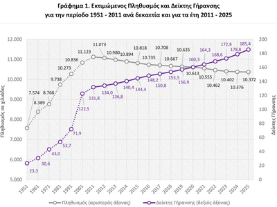 Παράλληλα, εξίσου ανησυχητικά είναι και τα δημογραφικά χαρακτηριστικά: Την 1η Ιανουαρίου του 2025 ο πληθυσμός ηλικίας 65 ετών και άνω αντιστοιχούσε στο 23,7%, ενώ τα παιδιά 0–14 ετών μόλις στο 12,8%.