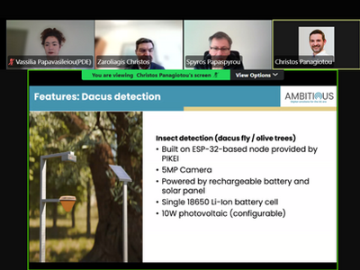 Όπως τονίζει σε ανακοίνωσή της η περιφέρεια, "σκοπός της συνάντησης ήταν η παρουσίαση και αναλυτική ενημέρωση σχετικά με το πιλοτικό σύστημα αναγνώρισης του Δάκου του εντόμου που προσβάλλει τις ελαιοκαλλιέργειες, καθώς και το λογισμικό και η εγκατάσταση που αναπτύσσονται στο πλαίσιο του έργου Ambitious. Οι συμμετέχοντες ενημερώθηκαν διεξοδικά για τη λειτουργία του εργαλείου, τα μέχρι στιγμής αποτελέσματα και τις τεχνικές παραμέτρους εφαρμογής του στο πεδίο.