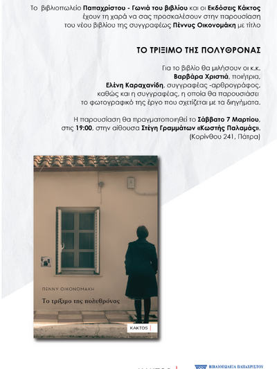 Το βιβλιοπωλείο Παπαχρίστου - Γωνιά του Βιβλίου και οι Εκδόσεις Κάκτος προσκαλούν το κοινό στην εκδήλωση παρουσίασης του νέου βιβλίου της Πέννυς Οικονομάκη: «Το Τρίξιμο της Πολυθρόνας». Η εκδήλωση θα πραγματοποιηθεί αυτό το Σάββατο 7 Μαρτίου 2026 και ώρα 19:00 στη Στέγη Γραμμάτων ''Κωστής Παλαμάς'' στην οδό Κορίνθου 241, στην Πάτρα.