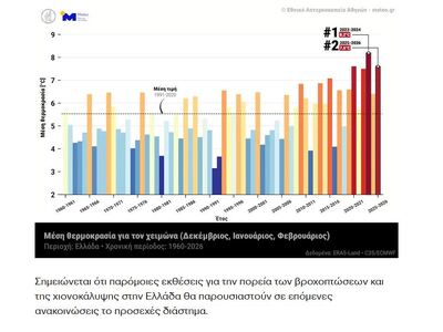 Η μέση θερμοκρασία στην Ελλάδα για τη χειμερινή περίοδο, παρουσιάζει αύξηση κατά 1.8 °C από το 1960 έως το 2026