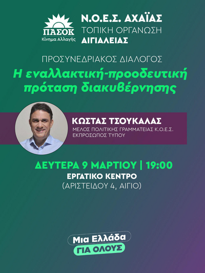 Εκδήλωση στο πλαίσιο του προσυνεδριακού διαλόγου θα πραγματοποιηθεί τη Δευτέρα 9 Μαρτίου στον Δήμο Αιγιάλειας, με στόχο την ανταλλαγή απόψεων και τη συζήτηση ενόψει του συνεδρίου του ΠΑΣΟΚ.