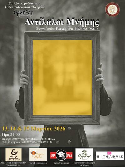 Η ομάδα χοροθεάτρου «ΟΡΜΗΤΕΣ» του Πανεπιστημίου Πατρών, παρουσιάζει τη χοροθεατρική performance «Αντίλαλοι Μνήμης» εστιάζοντας στη μνήμη ως προσωπικό και συλλογικό αποτύπωμα: στις αναμνήσεις που μας συγκροτούν, στις απώλειες που μας τραυματίζουν και στις σιωπές που κληρονομούμε χωρίς να τις έχουμε ζήσει.