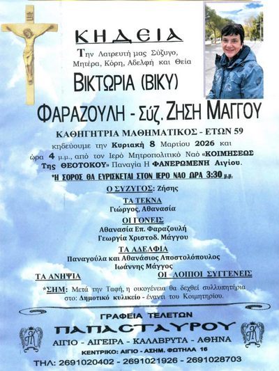 Θλίψη έχει προκαλέσει στο Αίγιο η είδηση του θανάτου της Βικτωρίας (Βίκυς) Φαραζούλη, συζύγου Ζήση Μάγγου, η οποία έφυγε από τη ζωή σε ηλικία 59 ετών. Η εκλιπούσα ήταν καθηγήτρια μαθηματικών και ιδιαίτερα αγαπητή στην τοπική κοινωνία.