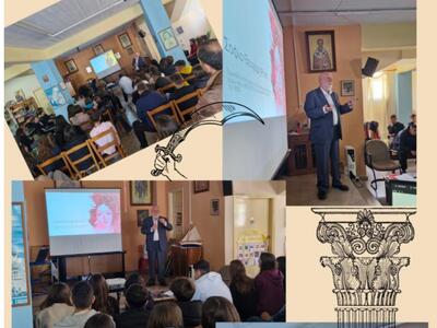 Επίσης ο κ. Σκιαθάς Κυριάκος, εκπαιδευτικός και συγγραφέας πολλών ιστορικών βιβλίων, στο ισόγειο του κτηρίου μίλησε στους μαθητές και τις μαθήτριες για τους τοπικούς ήρωες της Ελληνικής Επανάστασης, την οικογένεια των Νοταράδων, που ανέδειξε μοναχούς, ιερωμένους, αγωνιστές και οπλαρχηγούς, προύχοντες και πολιτικούς, με την περιπετειώδη ζωή τους, τις αντιπαλότητες και τα πάθη τους αλλά και την πολύτιμη προσφορά τους στον Αγώνα. Μετά την ολοζώντανη και ευχάριστη παρουσίαση μαθητές και μαθήτριες συμμετείχαν σε διαδραστικό παιχνίδι πολλαπλής επιλογής, που μαγνήτισε το ενδιαφέρον τους και ενεργοποίησε τη συμμετοχή τους. Τέλος τα ιστορικά βιβλία-δώρα του κου Σκιαθά θα αποτελούν στη βιβλιοθήκη μας πολύτιμο διδακτικό εργαλείο και ανάμνηση και υπόμνηση της μελλοντικής συνεργασίας μας.