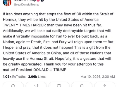 Ο Ντόναλντ Τραμπ, απηύθυνε λίγο πριν τις 3 π.μ. της Τρίτης (10.03.2026) ώρα Ελλάδας, αυστηρή προειδοποίηση προς το Ιράν, δηλώνοντας ότι οποιαδήποτε ενέργεια που θα διακόψει τη ροή πετρελαίου μέσω των Στενών του Ορμούζ θα αντιμετωπιστεί με πλήγματα 20 φορές ισχυρότερα από όσα έχουν γίνει έως τώρα.