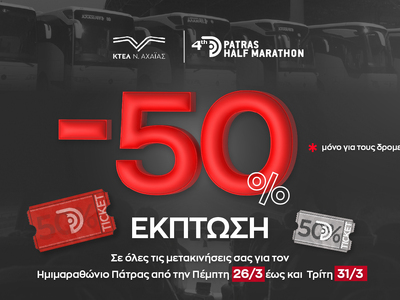 Η έκπτωση ισχύει για το διάστημα Πέμπτη 26 Μαρτίου έως Τρίτη 31 Μαρτίου 2026 και καλύπτει τη μετακίνηση από και προς την Πάτρα τόσο των δρομέων όσο και ενός συνοδού τους.