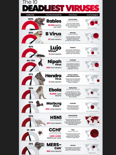 Οι περισσότεροι από τους πιο θανατηφόρους ιούς στον κόσμο προέρχονται από ζώα, όπως νυχτερίδες, τρωκτικά, καμήλες και πουλιά.