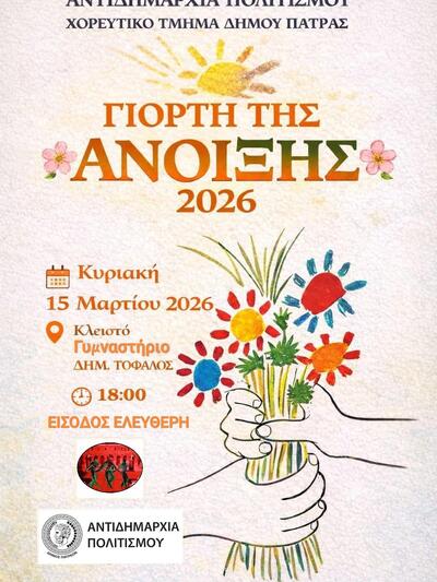To Χορευτικό Τμήμα του Δήμου Πατρέων στις 6 το απόγευμα της Κυριακής 15 Μαρτίου 2026, υποδέχεται την άνοιξη με μία ξεχωριστή χορευτική γιορτή.
