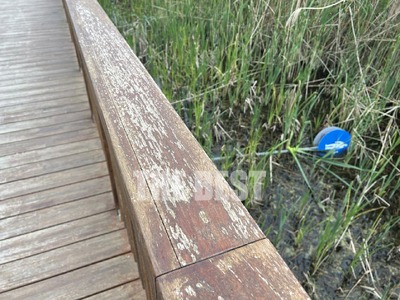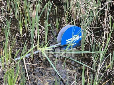 Παράλληλα, σε σημείο του έλους διακρίνεται πεταμένη μέσα στο νερό μια πινακίδα σήμανσης, η οποία φαίνεται να έχει αποκολληθεί και να έχει καταλήξει ανάμεσα στα καλάμια.