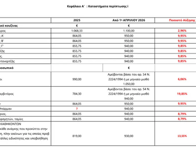 Αντίστοιχα, για τους μάγειρες Γ΄, τους μπουφετζήδες, τους λαντζέρηδες και τους ψήστες οι αποδοχές αυξάνονται από 855,75 ευρώ σε 940 ευρώ, καταγράφοντας αύξηση περίπου 9,85%.