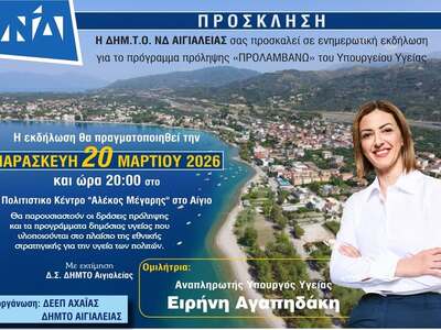 Η Διοικούσα Επιτροπή Εκλογικής Περιφέρειας Αχαΐας της Νέας Δημοκρατίας και η Δημοτική Τοπική Οργάνωση ΝΔ Αιγιαλείας σάς προσκαλούν στην ενημερωτική εκδήλωση