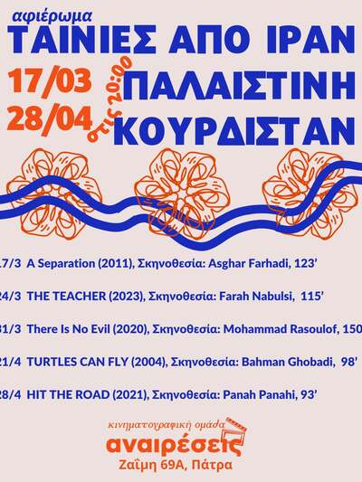 Ένα κινηματογραφικό αφιέρωμα με ταινίες από το Ιράν, την Παλαιστίνη και το Κουρδιστάν κάθε Τρίτη θα πραγματοποιηθεί στη Λέσχη Αναιρέσεις, στην οδό Ζαΐμη 69Α, στην Πάτρα.