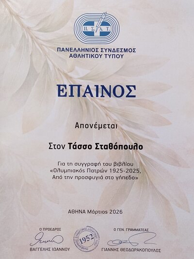 Το Βραβείο «Κώστας Μότσης» στον Χρυσόστομο Τρίμμη για την επιμέλεια της έκδοσης «Magnesia Sports», με στοιχεία για τον κλασσικό αθλητισμό, Εφημερίδα «Μαγνησία». Η βράβευση έγινε από τον Επί Τιμή Αντιπρόεδρο του ΠΣΑΤ Κώστα Μυλωνά, συνοδευόμενο από τον ταμία του Συνδέσμου, Κωνσταντίνο Χατζηδημητρίου.