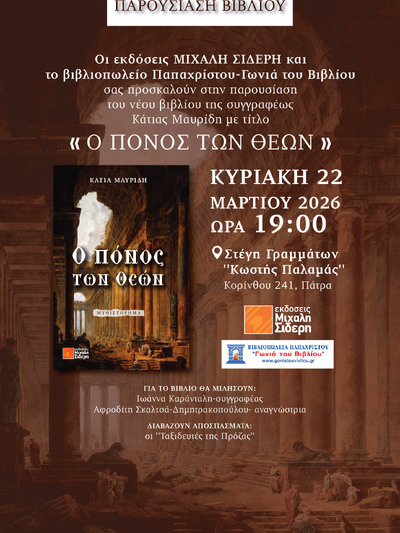 Οι εκδόσεις Σιδέρη και το βιβλιοπωλείο Παπαχρίστου -Γωνιά του Βιβλίου προσκαλούν το κοινό στην εκδήλωση παρουσίασης του νέου βιβλίου της Αχαιής στην καταγωγή, συγγραφέως Κάτιας Μαυρίδη με τίτλο: "Ο Πόνος των Θεών" την Κυριακή 22 Μαρτίου 2026 & ώρα 7 το απόγευμα στην Στέγη Γραμμάτων ''Κωστής Παλαμάς'' στην οδό Κορίνθου 241 στην Πάτρα.