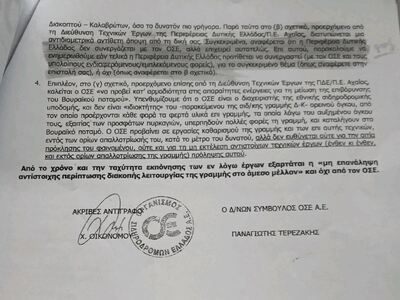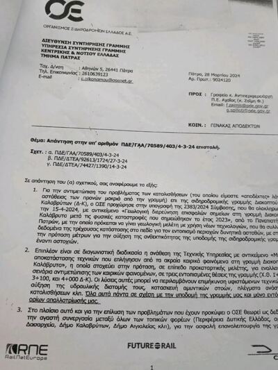 Από την πλευρά του, ο κ. Γιώργος Μπέσκος, πρόεδρος του Δικηγορικού Συλλόγου Αιγίου, μέσω ανάρτησής του στο Facebook, δημοσίευσε ένα έγγραφο του ΟΣΕ της 28ης Μαρτίου 2024, που εκδόθηκε ως απάντηση σε αναφορά και κοινοποιήθηκε σε σειρά υπουργείων και αρμόδιων υπηρεσιών, για την κατάσταση στη γραμμή του Οδοντωτού Σιδηροδρόμου Διακοπτού – Καλαβρύτων.