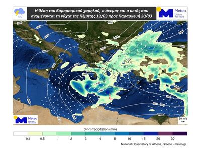 Την Πέμπτη 19 Μαρτίου βροχές αναμένονται κυρίως στη Δυτική Μακεδονία, στα κεντρικά και νότια ηπειρωτικά, στο Ιόνιο, στο Αιγαίο και στην Κρήτη ενώ πιθανότητα καταιγίδων υπάρχει κυρίως για το Νότιο Ιόνιο και τα δυτικά της Πελοποννήσου. Χιονοπτώσεις θα εκδηλωθούν στα ορεινά των προαναφερθέντων ηπειρωτικών.