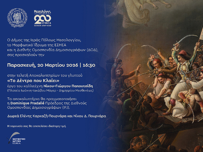 Ο Δήμος της Ιεράς Πόλεως Μεσολογγίου, το Μορφωτικό Ίδρυμα της ΕΣΗΕΑ και η Διεθνής Ομοσπονδία Δημοσιογράφων (ΔΟΔ) διοργανώνουν την τελετή αποκαλυπτηρίων του γλυπτού «Το Δέντρο που Κλαίει», την Παρασκευή 20 Μαρτίου 2026 και ώρα 16:30.