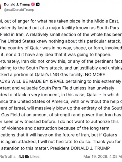 «Το Ισραήλ, από οργή για όσα συνέβησαν στη Μέση Ανατολή, επιτέθηκε με βία σε μια σημαντική εγκατάσταση γνωστή ως το πεδίο φυσικού αερίου South Pars στο Ιράν. Ένα σχετικά μικρό τμήμα του πεδίου χτυπήθηκε. Οι Ηνωμένες Πολιτείες δεν είχαν καμία γνώση για αυτήν την επίθεση και το Κατάρ δεν είχε καμία απολύτως εμπλοκή, ούτε γνώριζε ότι επρόκειτο να συμβεί. Δυστυχώς, το Ιράν δεν γνώριζε αυτό ή οποιαδήποτε από τα σχετικά γεγονότα που αφορούσαν την επίθεση στο South Pars και άδικα και αβάσιμα επιτέθηκε σε μια μέρος της εγκατάστασης LNG του Κατάρ.