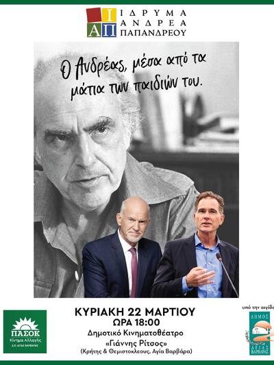 Σε ένα ταξίδι στον χρόνο και μαζί στην πολυδιάστατη προσωπικότητα του Ανδρέα Παπανδρέου, που καθόρισε με την παρουσία του τη σύγχρονη ιστορία του τόπου, θα έχουν την ευκαιρία να συμμετέχουν όσοι βρεθούν στην εκδήλωση με θέμα «Ο Ανδρέας μέσα από τα μάτια των παιδιών του», που διοργανώνει το Ίδρυμα Ανδρέα Παπανδρέου σε συνεργασια με την Δ.Ο. ΠΑΣΟΚ Αγίας Βαρβαρας και υπό την αιγίδα του Δήμου Αγίας Βαρβαρας, την Κυριακή 22 Μαρτίου, στις 18:00.
