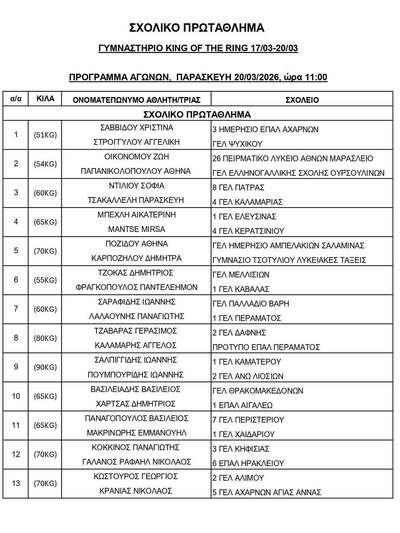 Παραθέτουμε το αυριανό πρόγραμμα (Παρασκευή 20/3) των Πανελληνίων Αγώνων Πυγμαχίας των Γενικών και Επαγγελματικών Λυκείων (ΓΕΛ και ΕΠΑΛ) του σχολικού έτους 2025-2026.