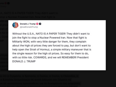 «Χωρίς τις ΗΠΑ, το ΝΑΤΟ είναι ένας χάρτινος τίγρης!», έγραψε ο Τραμπ σε ανάρτησή του στα μέσα κοινωνικής δικτύωσης.