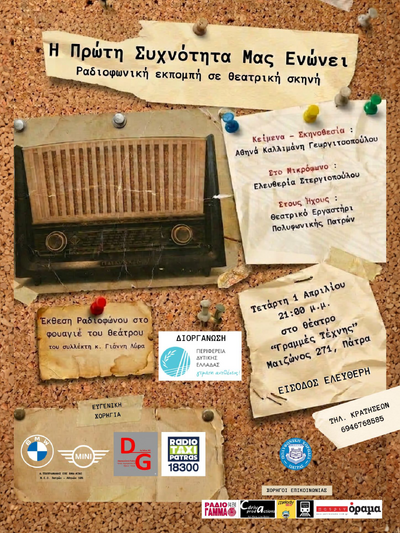 Η Περιφέρεια Δυτικής Ελλάδας διοργανώνει και αναθέτει στην ΚΟΙΝΣΕΠ, Βήματα Ελευθερίας, την παραγωγή μουσικοθεατρικής παράστασης με θέμα το ραδιόφωνο.