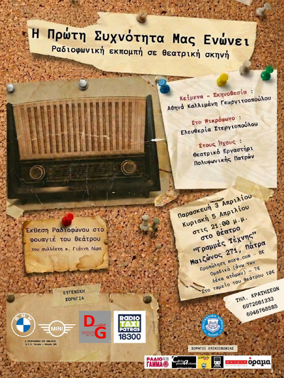 Η ραδιοφωνική παραγωγός, Ελευθερία Στεργιοπούλου, σε συνεργασία με το Θεατρικό Εργαστήρι της Πολυφωνικής Πατρών παρουσιάζουν το θεατρικό έργο: «Η Πρώτη Συχνότητα μάς Ενώνει» σε σκηνοθεσία και κείμενα της Αθηνάς Καλλιμάνη Γεωργιτσοπούλου, στο θέατρο «Γραμμές Τέχνης» στην Πάτρα (Μαιζώνος 271- έναντι ΣΣ Αγίου Ανδρέα).