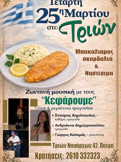 Αυτή την Τετάρτη δε, στη γιορτή της 25ης Μαρτίου, το "Τριών" εμπλουτιζει το μενού του και με νηστίσιμες λιχουδιές και βέβαια με τον παραδοσιακό βακαλάο σκορδαλιά. Και πάντα με τη γνωστή ποιότητα και φυσικά με τα καλύτερα ψητά της πόλης.