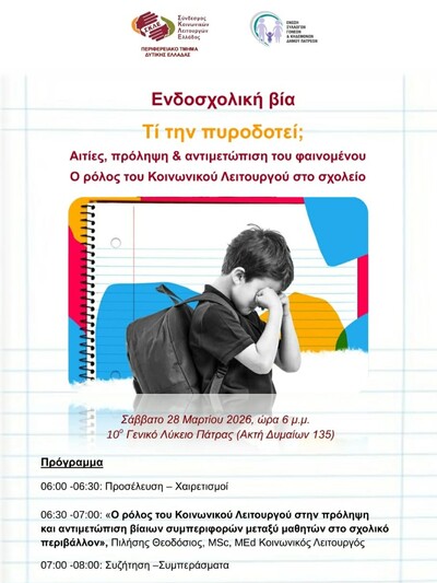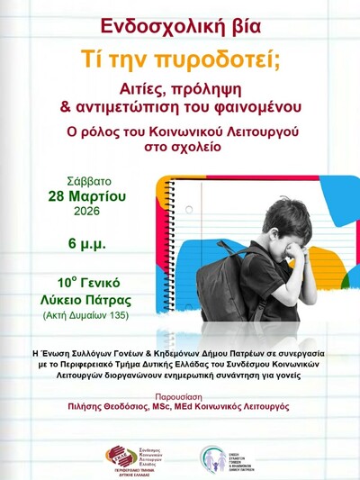 Η Ένωση Συλλόγων Γονέων & Κηδεμόνων Δήμου Πατρέων, σε συνεργασία με το Περιφερειακό Τμήμα Δυτικής Ελλάδας του Συνδέσμου Κοινωνικών Λειτουργών Ελλάδας (ΣΚΛΕ), διοργανώνουν ενημερωτική εκδήλωση με θέμα: «Ενδοσχολική βία – Τι την πυροδοτεί; Αιτίες, πρόληψη & αντιμετώπιση του φαινομένου. Ο ρόλος του Κοινωνικού Λειτουργού στο σχολείο».