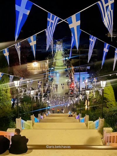 Σκαλοπάτι το σκαλοπάτι, η οδός Αγίου Νικολάου ντύνεται στα γαλανόλευκα, με τα σημαιάκια να κυματίζουν σαν μικρές ανάσες μνήμης και περηφάνιας για την 25η Μαρτίου.