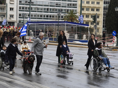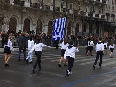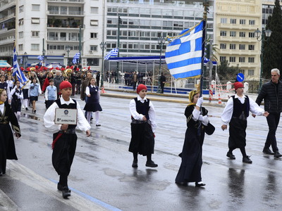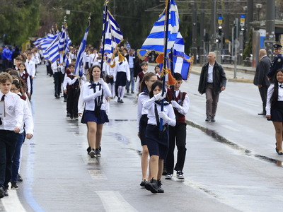 Κάτω από τον συννεφιασμένο αθηναϊκό ουρανό διεξάγεται η μαθητική παρέλαση για τον εορτασμό της εθνικής επετείου της 25ης Μαρτίου 1821.