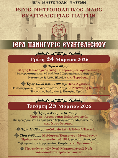 Ανήμερα την Τετάρτη 25-3-2026 που είναι και η εθνική επέτειος της κήρυξης της Ελληνικής Επανάστασης του 1821, στη Θεία λειτουργία το πρωί θα χοροσταστήσει ο σεβασμιότατος Μητροπολίτης Πατρών κ.κ. Χρυσόστομος που θα κηρύξει και το Θείο λόγο.