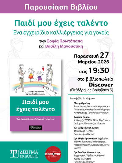 Οι Εκδόσεις Δίσιγμα και το Βιβλιοπωλείο Discover προσκαλούν το κοινό στην παρουσίαση του βιβλίου της Σοφίας Πρωτόπαπα και του Βασίλη Μανουσάκη: "Παιδί μου έχεις ταλέντο. Ένα εγχειρίδιο καλλιέργειας για γονείς" αυτή την Παρασκευή 27 Μαρτίου 2026 στις 19:30 στο βιβλιοπωλείο Discover (Πεζόδρομος Βούρβαχη 3, Πάτρα, τηλ. 2610624916).