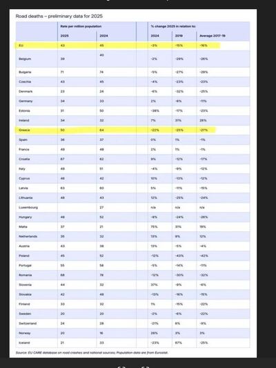 Την ίδια στιγμή, ο ευρωπαϊκός μέσος όρος καταγράφει μείωση μόλις 3%, με τη χώρα μας να καταγράφει μία από τις καλύτερες επιδόσεις, πίσω μόνο από την Εσθονία. Η εξέλιξη αυτή έρχεται να επιβεβαιώσει, με επίσημα ευρωπαϊκά δεδομένα, τη σημαντική πρόοδο που καταγράφηκε το 2025, χρονιά κατά την οποία η Ελλάδα σημείωσε τη μεγαλύτερη μείωση θανάτων από τροχαία στην ιστορία της, με 517 θανάτους έναντι 665 το 2024, δηλαδή μείωση 22%. Ο αριθμός αυτός είναι ταυτόχρονα και ο χαμηλότερος από το 1963 για τη χώρα μας.
