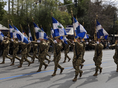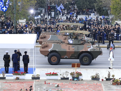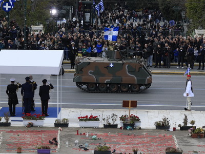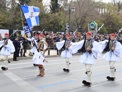Πραγματοποιήθηκε η μεγάλη στρατιωτική παρέλαση στην Αθήνα για την 25η Μαρτίου, στο Σύνταγμα ενώπιον του Προέδρου της Δημοκρατίας Κωνσταντίνου Τασούλα, που ολοκληρώθηκε λίγο μετά τις 12:35 μ.μ. Όπως κάθε χρόνο, πάνω από το χώρο όπου πραγματοποιήθηκε η παρέλαση, πραγματοποιήθηκαν πτήσεις πλήθους μαχητικών αεροσκαφών της Πολεμικής Αεροπορίας καθώς και ελικόπτερα όλων των τύπων.